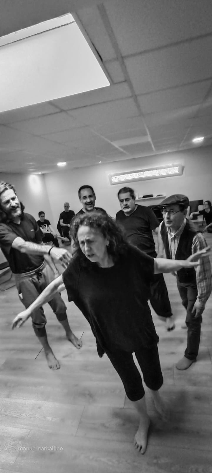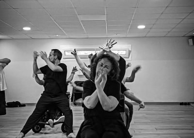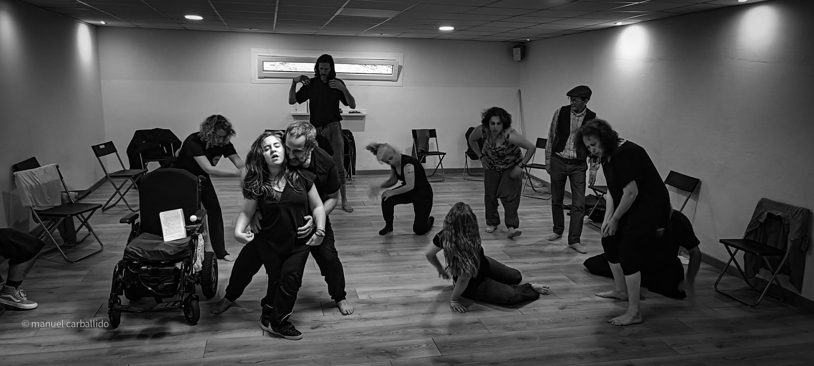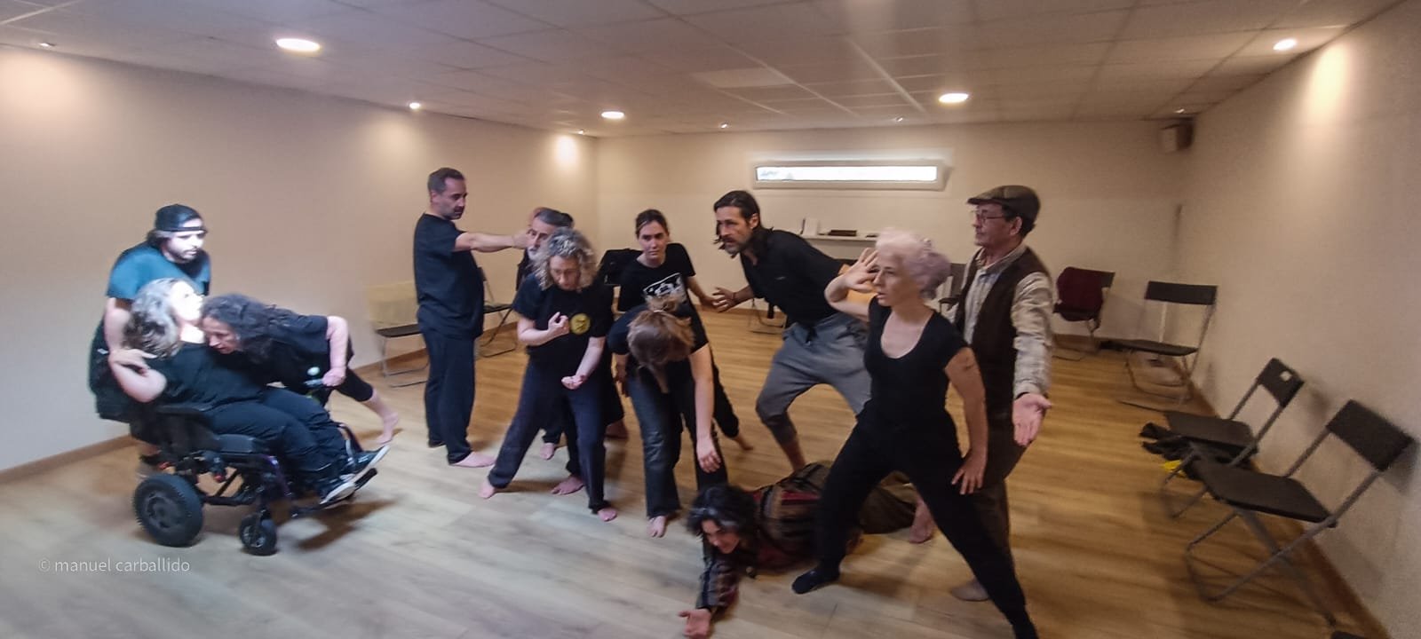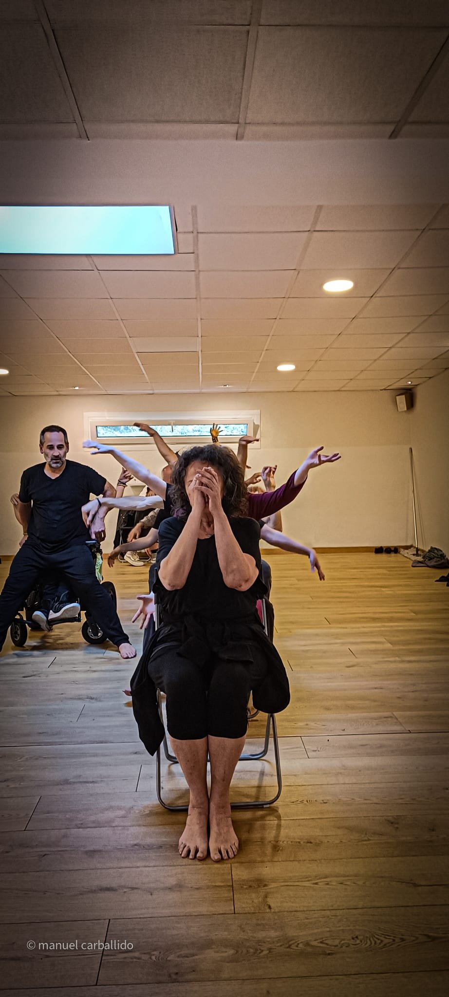 16:30 h recollida de usuarios da AIND 16:00 h Visita e Almacenamento Fundación Luis Seoane, contido. Lema da exposición fotográfica. Desenvolvemento do obradoiro de creación arte-terapéutica presencial e movemento inclusivo ata as 20:00 h. 1.-Traballo de recoñecemento do corpo no espazo, revisión de articulacións e músculos, quecemento das extremidades para posteriormente facilitar o movemento na psicomotricidade fina dos traballos artísticos posteriores. 2.-Exercicios de respiración e relaxación respiratoria empregando o propio espazo do museo como punto de ancoraxe. 3.-Este obradoiro de movemento inclusivo desenvolveuse tomando como slogan a arquitectura do museo, ou inspiración para a experiencia estética, concretamente o patio interior e a exposición fotográfica así como o ancho total da sala de fundación. Traballamos o recoñecemento cego do corpo a través das emocións que alberga. Busca de bloqueos musculares, áreas de carga emocional no corpo e identificación de articulacións con movemento limitado. Identificación da propia emoción na zona cervical e cervical. Traballamos a libre creación de movementos e Micro movementos das articulacións superiores independentes, en segundo lugar traballamos a coordinación dos movementos libres das extremidades superiores e inferiores. Estes movementos creados polos propios usuarios foron levados a unha intervención co tacto e o propio corpo no espazo do museo, atendendo aos ritmos musicais que acompañaban o exercicio. Traballouse a visión e a percepción sensorial do espazo. Finalmente, elaborouse unha coreografía inclusiva e grupal de intervención no espazo museístico, tendo en conta as capacidades físicas de cada usuario, un traballo de cohesión e integración do individuo ao grupo. 4.-No obradoiro de laboratorio cun amplo buffet de materiais, libre elección de materiais, e desenvolvemento creativo libre tipo Stern. Cada usuario, individualmente ou en grupo, desenvolveu a súa produción artística inspirada no obradoiro de movemento e a súa experiencia vital co movemento individual e colectivo, desenvolvendo unha produción artística que neste caso moitos traballaron en parella por decisión propia.5.-Unha vez rematadas as producións artísticas, a esencia do que cada usuario percibiu a través da súa propia experiencia estética transfórmase nun texto emocional ou experiencia vital ligada ao que a peza lle transmitiu. 6.-Volvemos ao espazo arquitectónico do museo e intervimos, cada usuario escolle onde deposita a peza da súa produción artística, e fai brevemente seu o espazo museístico. 7.-Para finalizar, cada usuario que o desexe expresa con palabras a súa experiencia durante o obradoiro de movemento inclusivo e comparte co grupo a súa relación co movemento, as dificultades ou frustracións no caso de persoas con limitacións físicas de movemento, os seus momentos Eureka, mentres bailaron, mentres eles creaban, sós, xuntos, o que os sorprendeu e o que os emocionou. De 20:00 a 20:30 horas, recollida e devolución dos seus usuarios á AIND. Participantes: AIND 12 Adafg 3 Centro de Menores 3 Aberto diverso 3