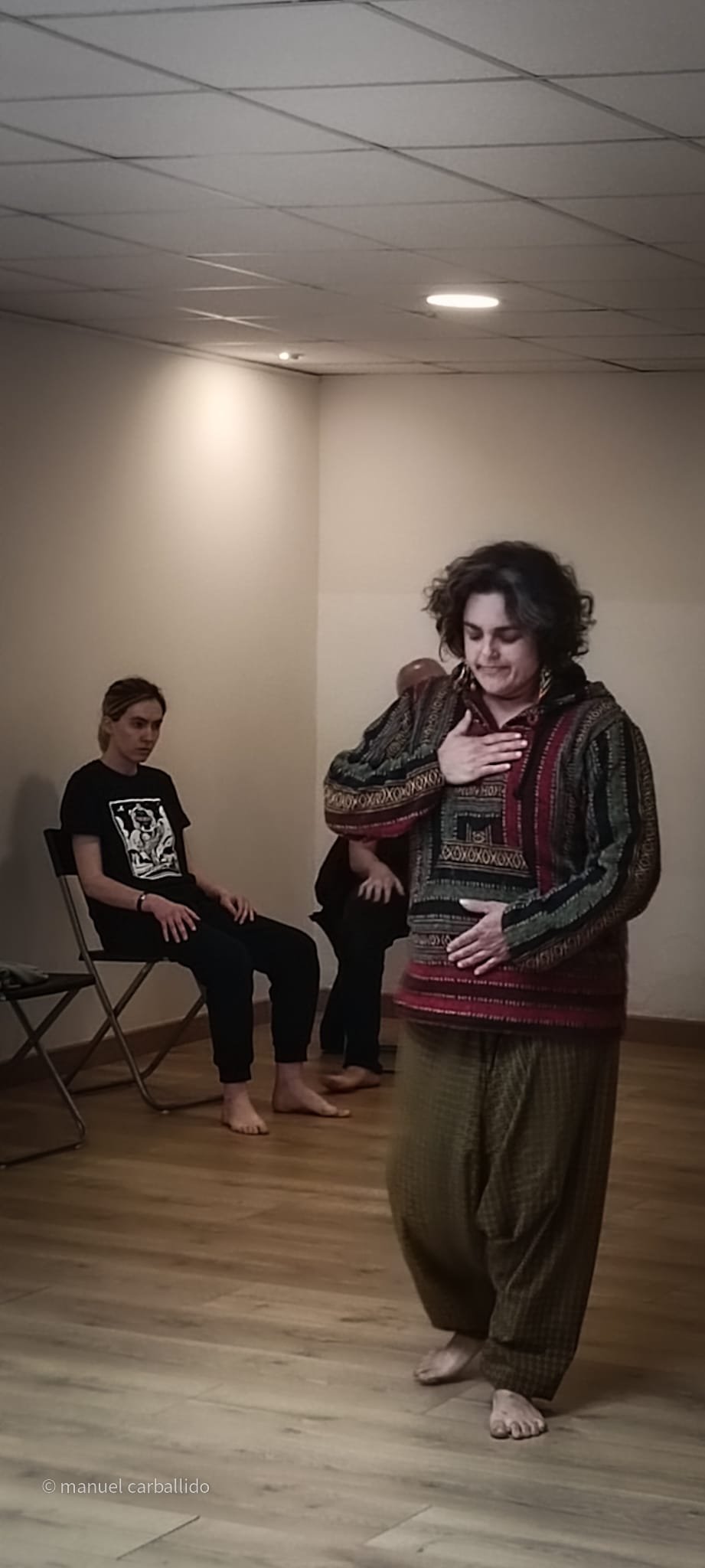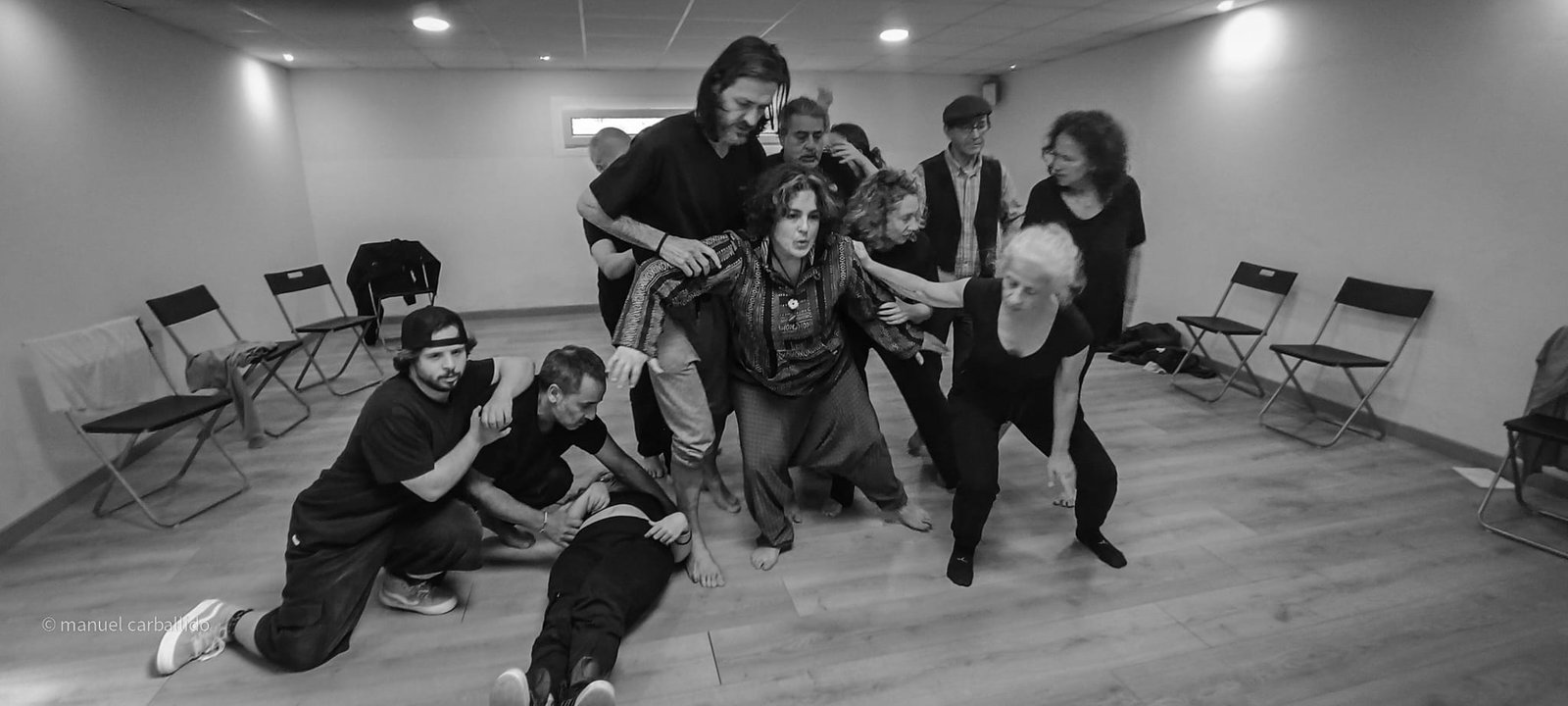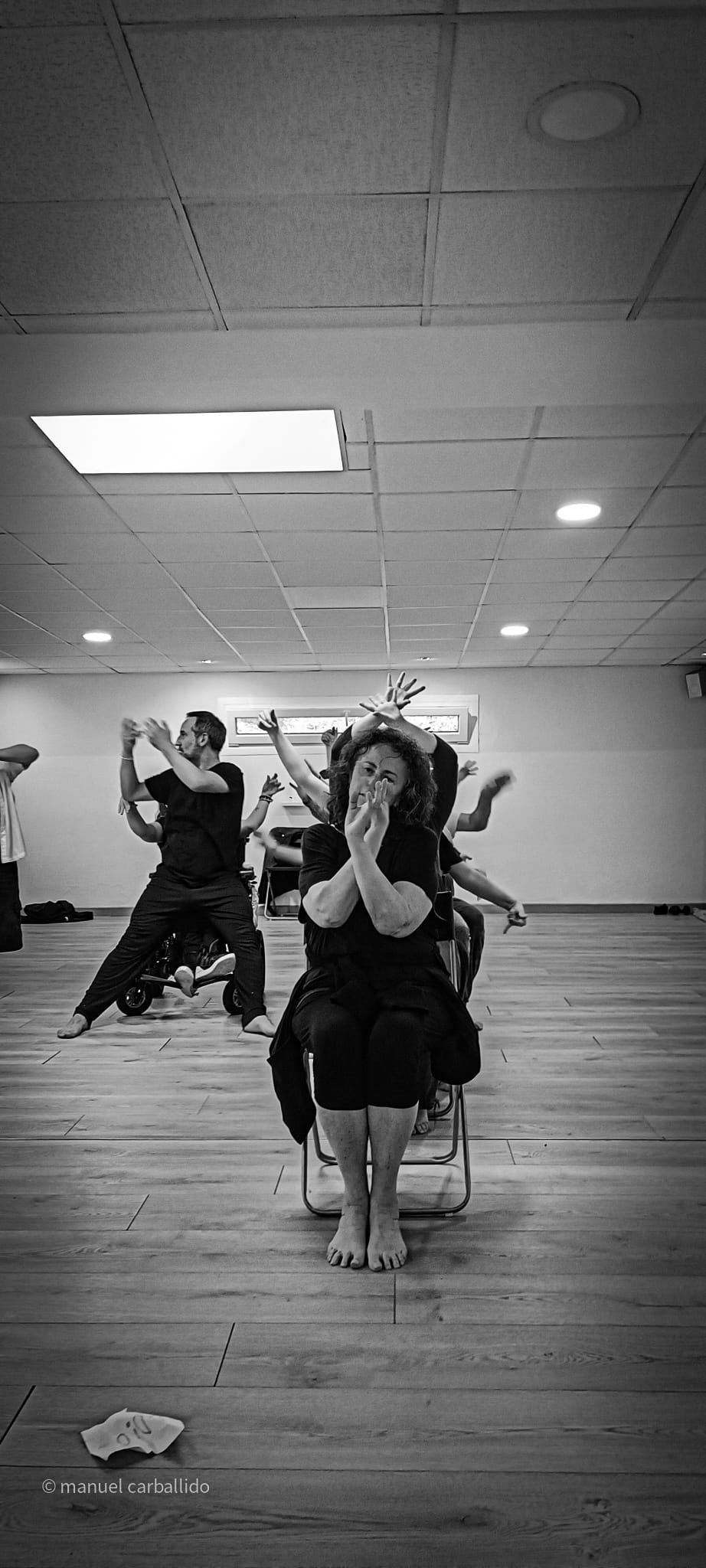 16:30 h recollida de usuarios da AIND 16:00 h Visita e Almacenamento Fundación Luis Seoane, contido. Lema da exposición fotográfica. Desenvolvemento do obradoiro de creación arte-terapéutica presencial e movemento inclusivo ata as 20:00 h. 1.-Traballo de recoñecemento do corpo no espazo, revisión de articulacións e músculos, quecemento das extremidades para posteriormente facilitar o movemento na psicomotricidade fina dos traballos artísticos posteriores. 2.-Exercicios de respiración e relaxación respiratoria empregando o propio espazo do museo como punto de ancoraxe. 3.-Este obradoiro de movemento inclusivo desenvolveuse tomando como slogan a arquitectura do museo, ou inspiración para a experiencia estética, concretamente o patio interior e a exposición fotográfica así como o ancho total da sala de fundación. Traballamos o recoñecemento cego do corpo a través das emocións que alberga. Busca de bloqueos musculares, áreas de carga emocional no corpo e identificación de articulacións con movemento limitado. Identificación da propia emoción na zona cervical e cervical. Traballamos a libre creación de movementos e Micro movementos das articulacións superiores independentes, en segundo lugar traballamos a coordinación dos movementos libres das extremidades superiores e inferiores. Estes movementos creados polos propios usuarios foron levados a unha intervención co tacto e o propio corpo no espazo do museo, atendendo aos ritmos musicais que acompañaban o exercicio. Traballouse a visión e a percepción sensorial do espazo. Finalmente, elaborouse unha coreografía inclusiva e grupal de intervención no espazo museístico, tendo en conta as capacidades físicas de cada usuario, un traballo de cohesión e integración do individuo ao grupo. 4.-No obradoiro de laboratorio cun amplo buffet de materiais, libre elección de materiais, e desenvolvemento creativo libre tipo Stern. Cada usuario, individualmente ou en grupo, desenvolveu a súa produción artística inspirada no obradoiro de movemento e a súa experiencia vital co movemento individual e colectivo, desenvolvendo unha produción artística que neste caso moitos traballaron en parella por decisión propia.5.-Unha vez rematadas as producións artísticas, a esencia do que cada usuario percibiu a través da súa propia experiencia estética transfórmase nun texto emocional ou experiencia vital ligada ao que a peza lle transmitiu. 6.-Volvemos ao espazo arquitectónico do museo e intervimos, cada usuario escolle onde deposita a peza da súa produción artística, e fai brevemente seu o espazo museístico. 7.-Para finalizar, cada usuario que o desexe expresa con palabras a súa experiencia durante o obradoiro de movemento inclusivo e comparte co grupo a súa relación co movemento, as dificultades ou frustracións no caso de persoas con limitacións físicas de movemento, os seus momentos Eureka, mentres bailaron, mentres eles creaban, sós, xuntos, o que os sorprendeu e o que os emocionou. De 20:00 a 20:30 horas, recollida e devolución dos seus usuarios á AIND. Participantes: AIND 12 Adafg 3 Centro de Menores 3 Aberto diverso 3